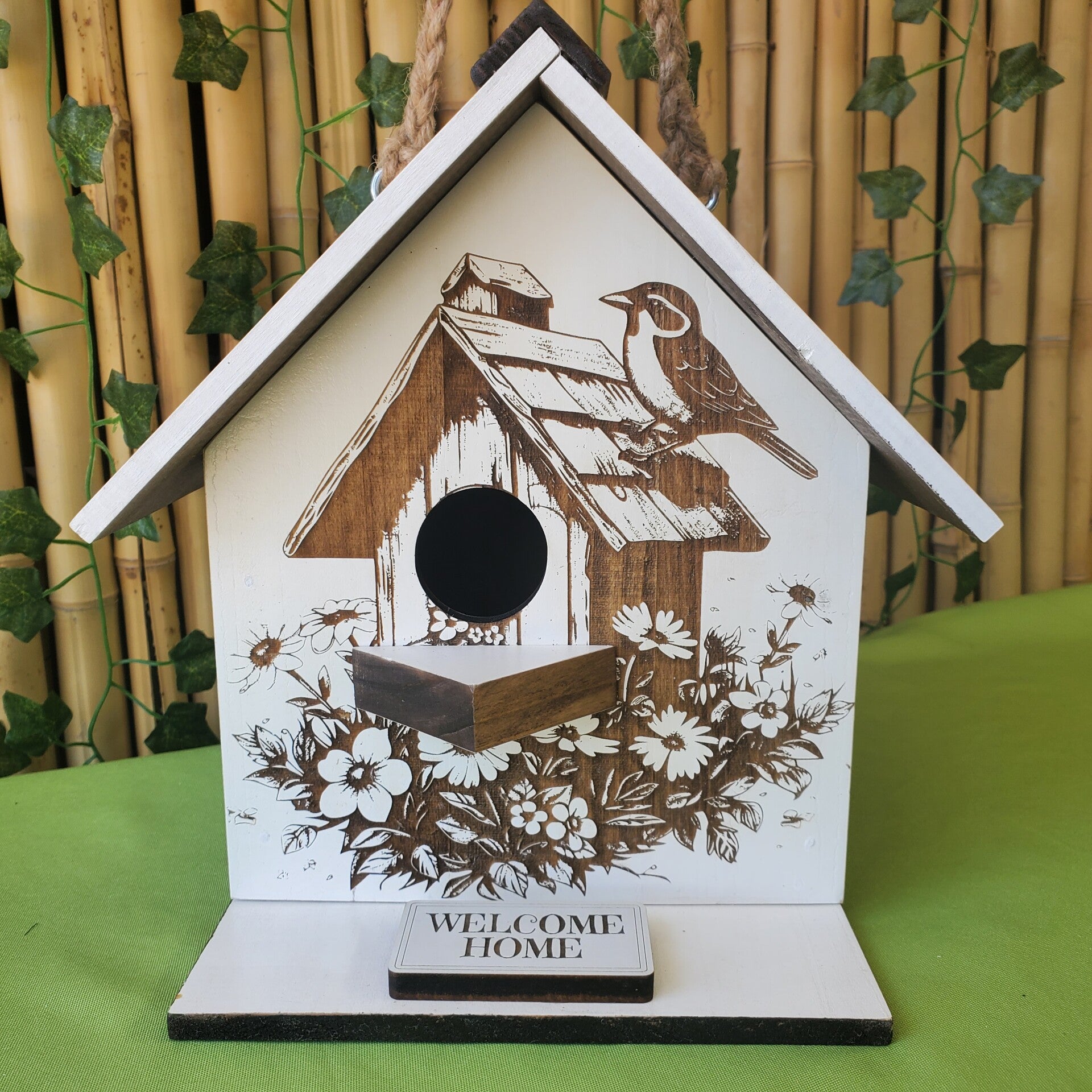 7.5"wide x 8.5" deep x 10.5" tall wooden birdhouse with removable bottom for cleaning. Birdhouse is made with 1/4 " poplar wood. Primed, painted and finished with gloss coating.