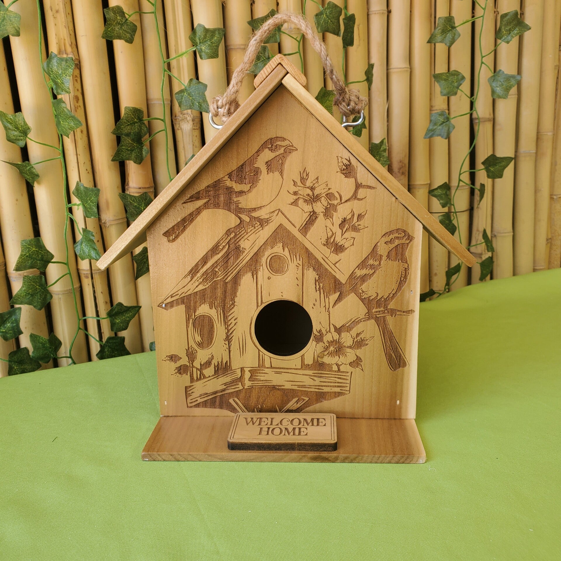 7.5" wide x 8.5" deep x 10.5" tall wooden birdhouse with removable bottom for cleaning.