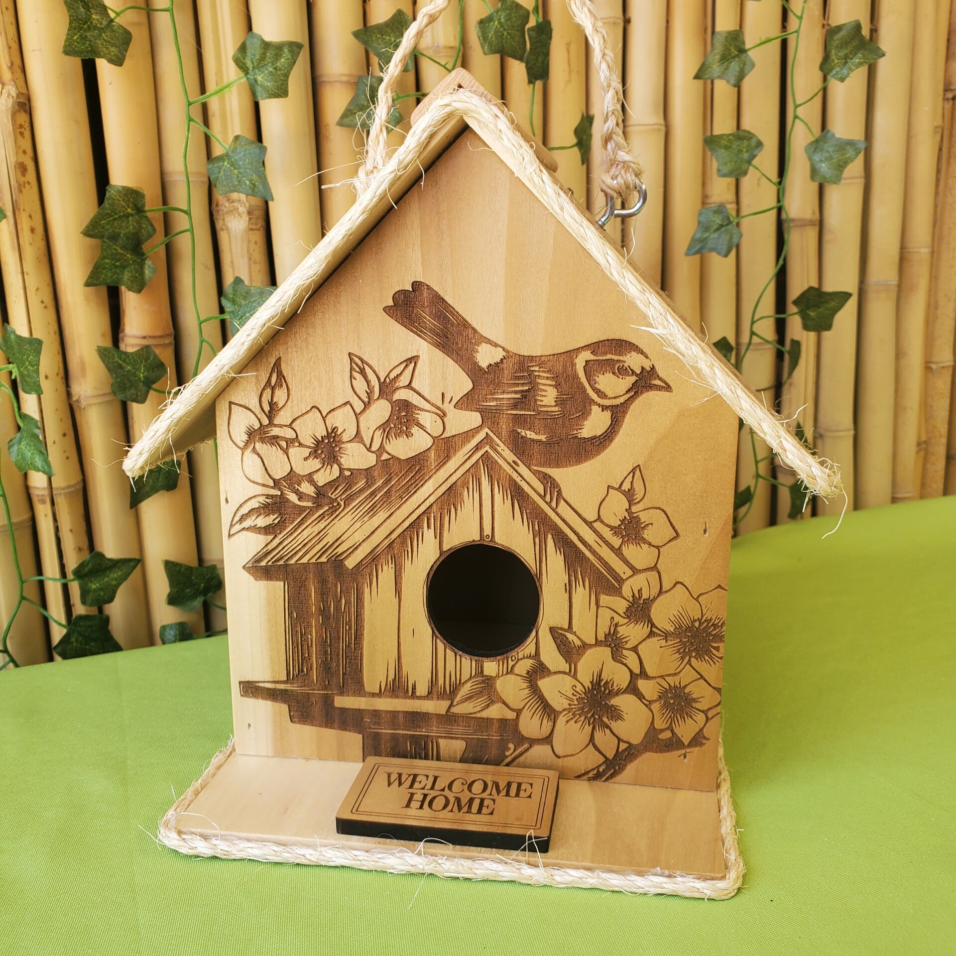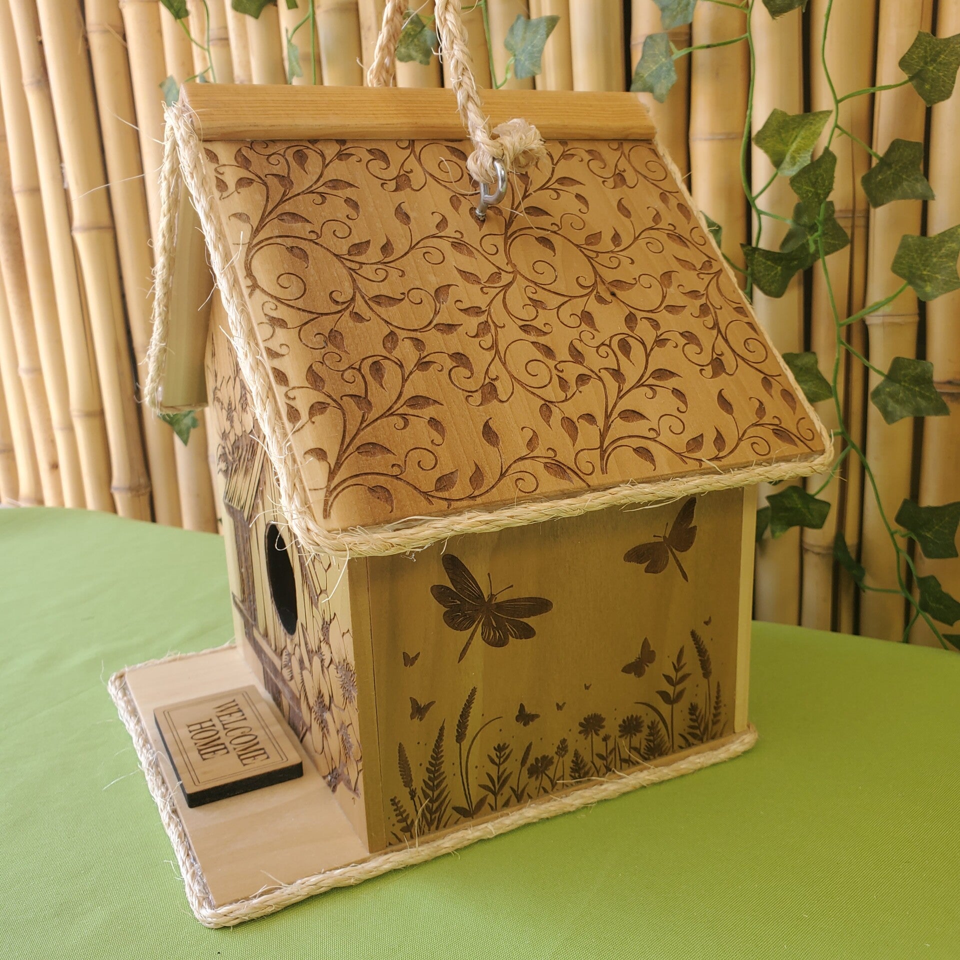 7.5" wide x 8.5" deep x 10.5 tall wooden birdhouse with removable bottom for cleaning.