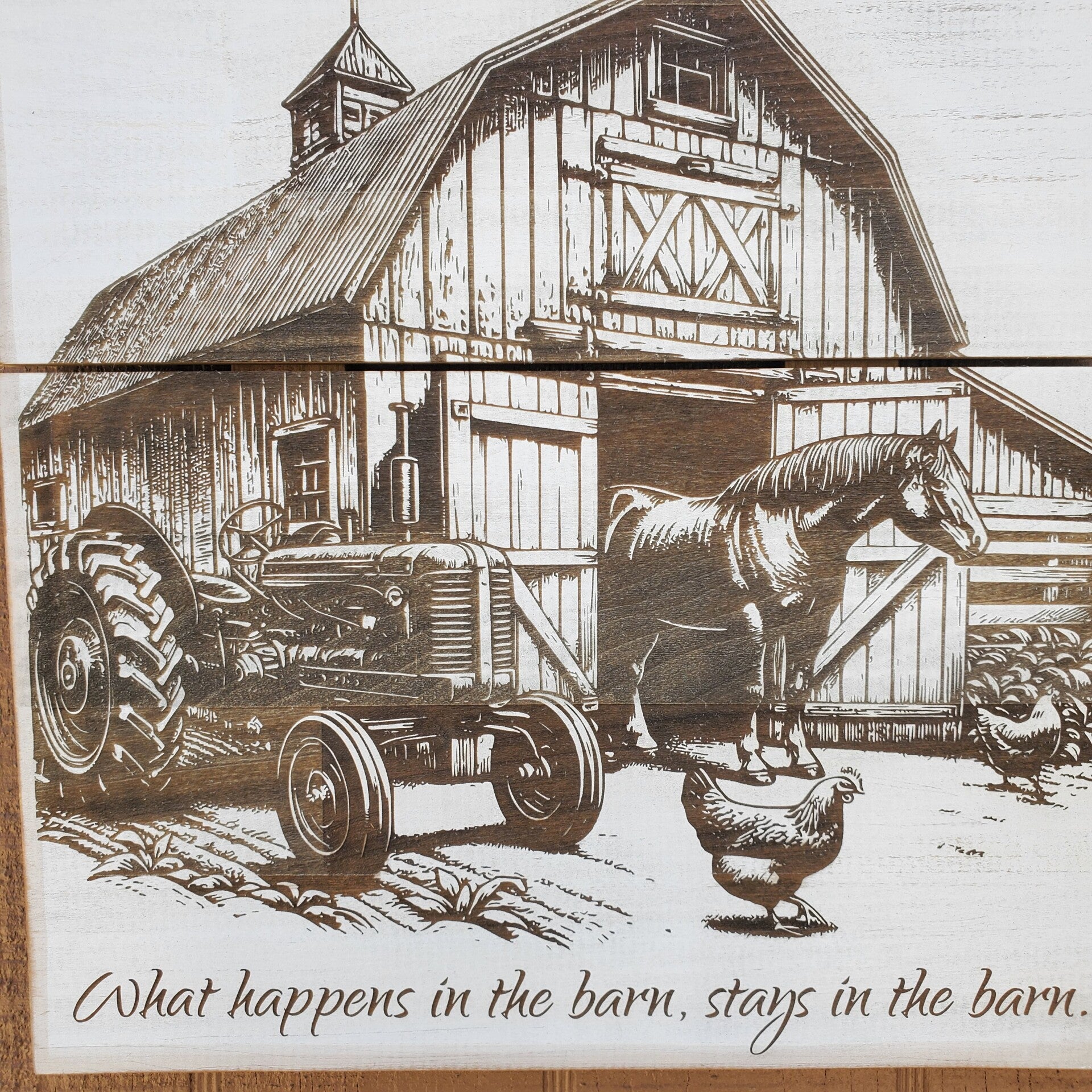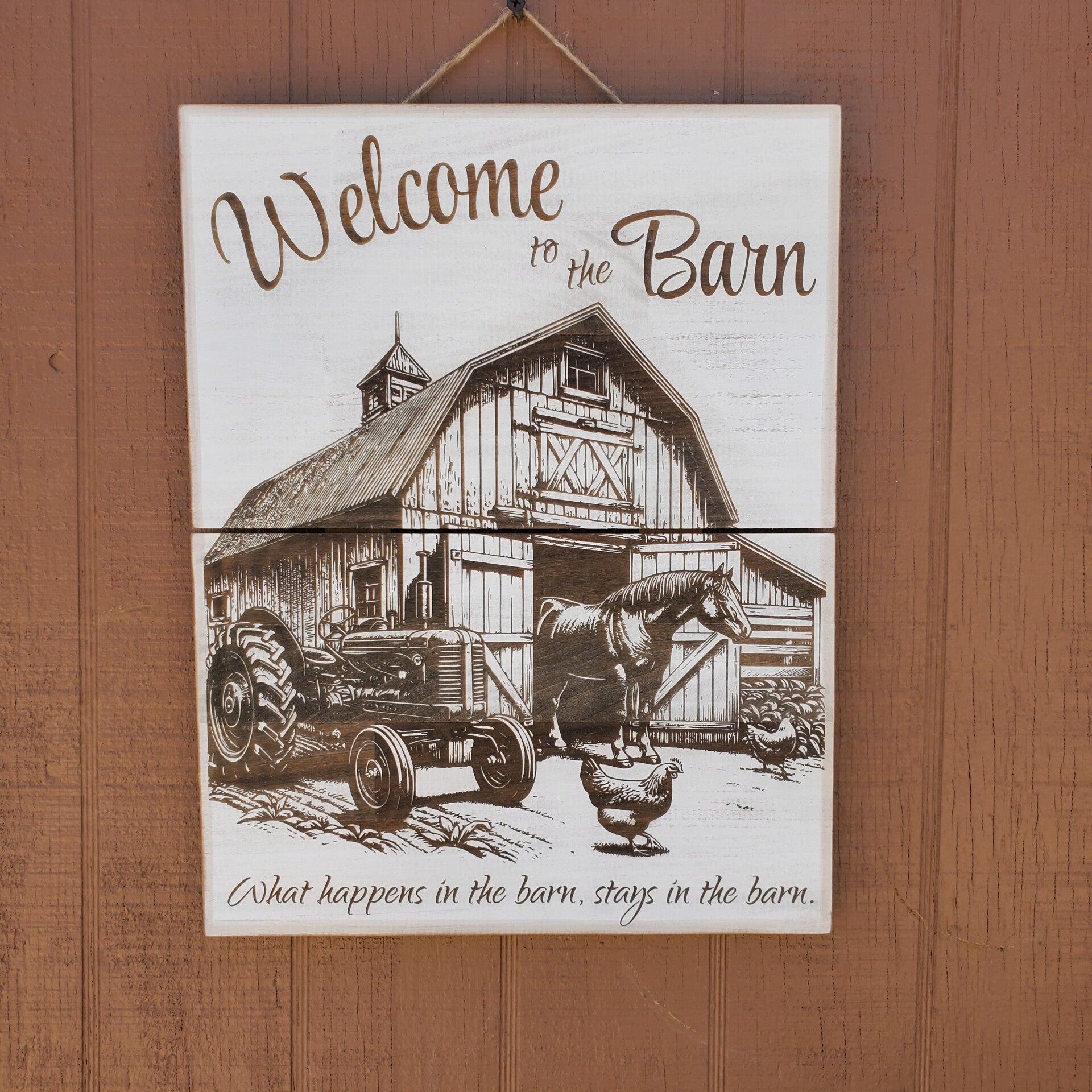 12"×15" rustic wooden hanging sign. Sign comes with hanging hardware installed.